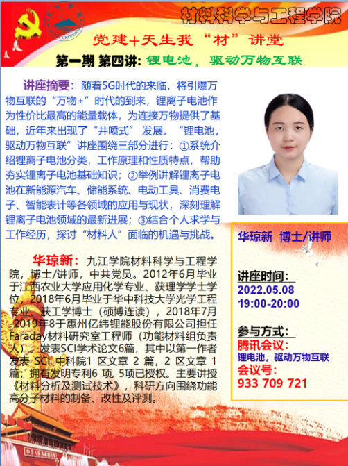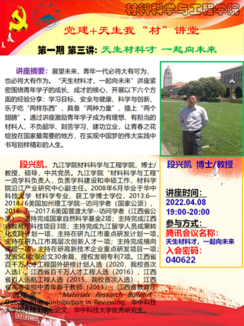 学院充分利用博士教师人数较多的优势,定期举办“党建+天生我‘材’”大讲堂,该活动旨在进一步发挥党员干部在立德树人中的带头作用,锻炼提升党员教师讲座能力,展示其学术水平,引导其做“四有好老师”,做学生的“四个引路人”,做到“四个相统一”,激发学术兴趣,营造良好的院风学风,为实现中华民族伟大复兴的中国梦,努力学习,成人成才。活动主要内容:面向全院师生结合个人求学、工作经历和研究情况,宣讲国家重大发展战略、分析国家“卡脖子”技术、普及国内外最新科技前沿、分享个人成长感悟与学术成果、解读学科专业与就业发展方向、解读各类项目和学科竞赛政策等。目前已开展了4期。