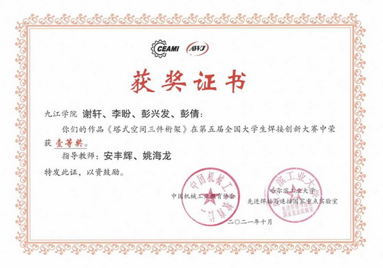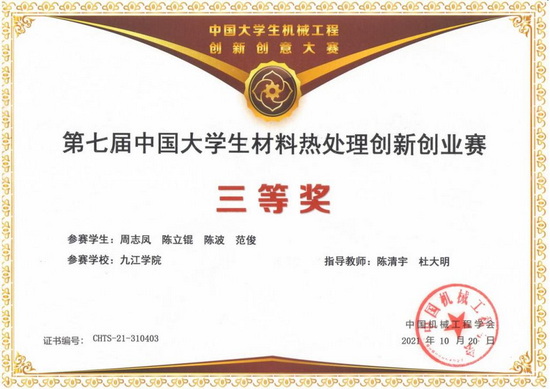 学院积极鼓励学生参加各类学科竞赛,荣获2021年中国大学生工程实践与创新能力大赛银奖1项;第六届江西省大学生工程训练综合能力竞赛金奖1项、银奖2项、铜奖1项;中国大学生材料热处理创新创业赛三等奖1项;第五届全国大学生焊接创新大赛一等奖1项、二等奖2项、三等奖1项;2021年江西省先进成图大赛二等奖1项;获得第十届全国大学生金相技能大赛二等奖1项、3等奖1项;第五届江西省大学生金相技能大赛一等奖1项、3等奖5项。