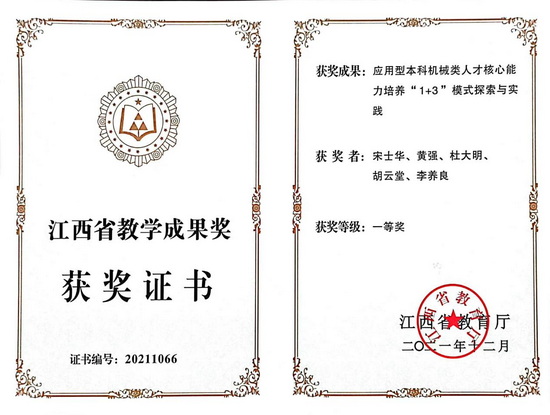 学院积极申报国家级、省级一流课程和教学改革等项目。2021年《机械制图》已通过江西省一流本科课程认定,《材料科学基础Ⅱ》等3门课程荣获校级一流本科课程建设立项,材料成型专业教学团队获批江西省高水平本科教学团队建设立项,教学改革研究项目成绩斐然,荣获江西省教学改革重点课题1项,一般课题1项,由我院教师杜大明、李养良参与的《应用型本科机械类人才核心能力培养“1+3”模式探索与实践》荣获江西省教学成果一等奖。