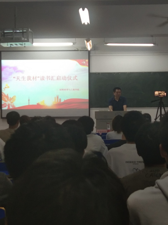 在全体与会人员同唱团歌下,拉开了此次会议的序幕。袁书记宣布本次活动正式启动。他指出,“‘天生我材’读书汇”是响应学院党委号召,继“‘天生我材’讲坛”之后,在我院举办的“天生我材”的又一活动,旨在完善广大同学知识结构和知识体系,使同学们在获得专业素养的同时,不断提升政治品格、道德修养和人文素养。