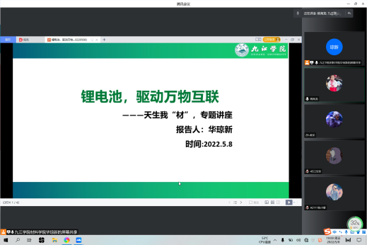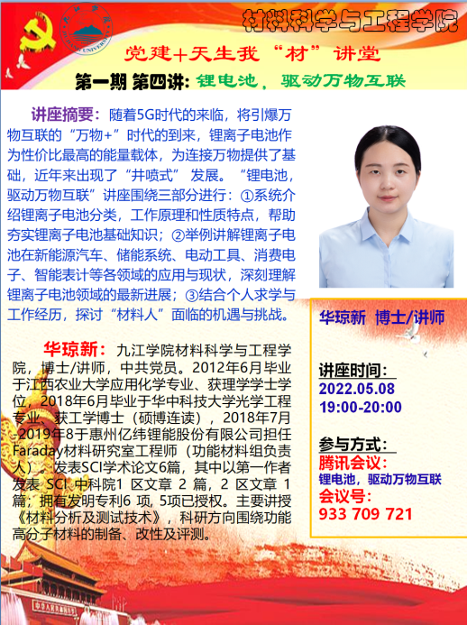 2022年5月8日,yl6809永利YL集团成功举办了“党建+天生我‘材’讲堂”的线上讲座活动,第一期第四讲由yl6809永利YL集团华琼新博士主讲,以“锂电池,驱动万物互联”为题,围绕三部分进行:①系统介绍锂离子电池分类,工作原理和性质特点,帮助夯实锂离子电池基础知识;②举例讲解锂离子电池在新能源汽车、储能系统、电动工具、消费电子、智能表计等各领域的应用与现状,深刻理解锂离子电池领域的最新进展;③结合个人求学与工作经历,探讨“材料人”面临的机遇与挑战。华琼新博士的精彩讲座引起了学生的广泛兴趣、线上交流不断。