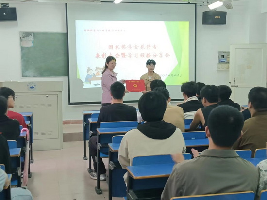 会仪伊始,陈娜代表学院为国家奖学金获得者欧阳辉颁发国家奖学金证书,并对其在学习态度、党团活动、学科竞赛、社会实践等方面取得的成绩表示肯定,勉励他在未来的学习和工作中彰显榜样力量,引领青年成长。鼓励同学们要珍惜现在的学习机会,学好专业技能本领。
