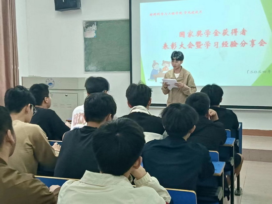 为了表彰优秀学子,树立榜样,传递正能量,响应学校学风建设月,涵养学院学风,推动校园文化的建设,yl6809永利YL集团于4月21日晚在竞知楼215召开了国家奖学金获得者表彰会暨学习经验分享会。2023年度国家奖学金获得者欧阳辉同学作经验分享,学院党委副书记陈娜、学生管理科科长梅红平及各班班长和学习委员参加此次分享会。