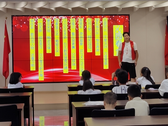 活动尾声的诗词高潮令人热血沸腾。刘致远志愿者手持竹简朗诵稿,带领全场齐诵《沁园春・雪》。“数风流人物,还看今朝” 的豪迈解析中,孩子们稚嫩嗓音与家长浑厚声线交织,将家国情怀融入琅琅书声,在实践站大厅久久回荡。