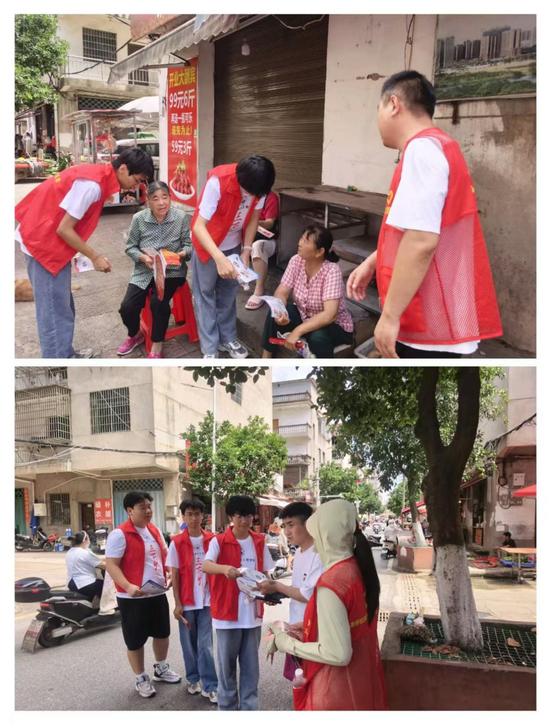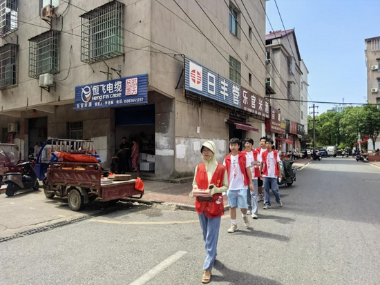 在高桥道社区,刘致远、沈学艺、包勇、卢星辰一行人与社区工作人员组成宣讲小队,深入居民家中开展普及工作。