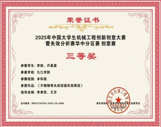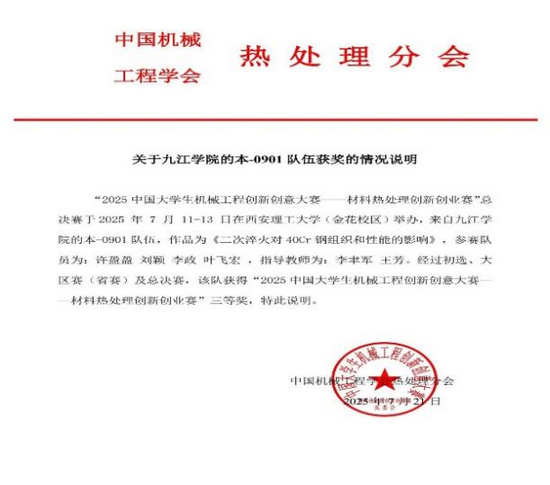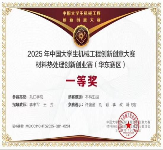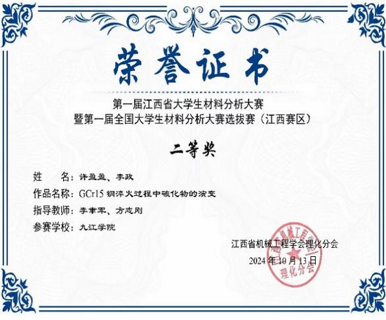 在学科竞赛的舞台上,许盈盈更是敢于挑战、勇于突破。她深知理论与实践结合的重要性,主动投身各类高水平竞赛,在实战中锤炼专业技能。在老师的悉心指导下,她与队友并肩作战,凭借扎实的专业知识和创新思维,在“2025年中国大学生机械工程创新创意大赛材料热处理创新创业赛”中脱颖而出,斩获华东赛区一等奖、国赛三等奖;在“第一届江西省大学生材料分析大赛暨全国大学生材料分析大赛选拔赛(江西赛区)”中,她参与的《GCr15钢淬火过程中碳化物的演变》项目荣获二等奖。谈及参赛经历,西安的材料热处理大赛让她印象尤为深刻:“那段时间,我们和指导老师反复打磨方案、熟悉PPT、模拟答辩,虽然过程艰辛,但每一次探讨都是思维的碰撞,每一次练习都是能力的提升,这份经历比成绩更珍贵。”