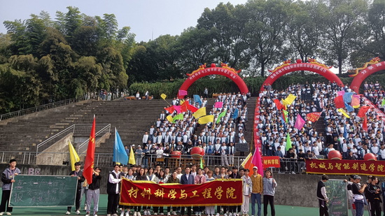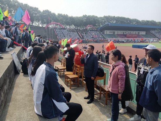 材料学院党委书记袁传发、党委副书记陈娜来到看台给同学们加油鼓劲,并对同学们的表现给予充分的肯定,袁书记希望大家把在本届运动会上所表现出的竞争意识、自信自强、拼搏向上和团结合作的精神发扬光大,用在我们今后的学习、生活、工作之中,以饱满的热情、激昂的斗志、拼搏的精神,创造出更优秀的成绩。