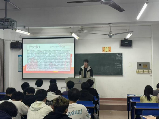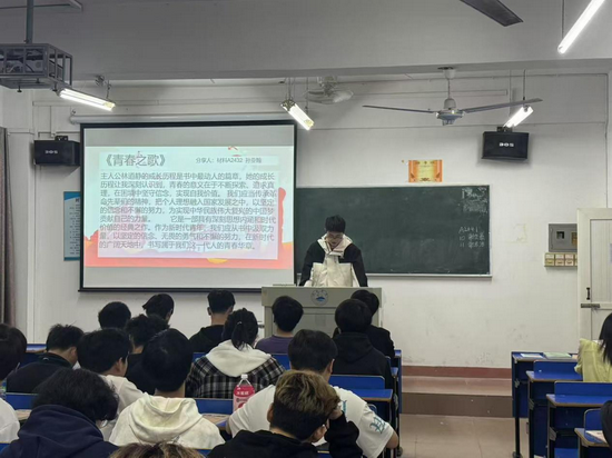 除了个人分享,分享会还设置了互动交流环节。同学们积极提问,就红色经典中的历史背景、人物形象等展开热烈讨论,进一步加深了大家对红色文化的理解。分享环节中,同学们积极踊跃发言,畅谈自己的阅读感悟。其中一名女同学手持《青春之歌》,激动地说道:“读完这本书,我仿佛看到了林道静等进步青年在那个动荡年代,为了追求真理,为了国家的独立和民族的解放,不惜放弃优越的生活,投身革命的热血激情。他们的爱国精神深深感染了我,在当下,我们虽身处和平年代,但同样需要这种为了理想拼搏奋斗的精神,努力学习知识,为祖国的繁荣富强贡献自己的力量。”同时还有一位男同学从《南京大屠杀:被二战遗忘的浩劫》中深刻认识到和平的来之不易,他声音低沉地说:“书中的描述令人痛心疾首,那是一段不能忘却的历史。我们必须铭记历史,珍惜现在的和平,同时也要不断强大自己的国家,避免悲剧再次发生。”