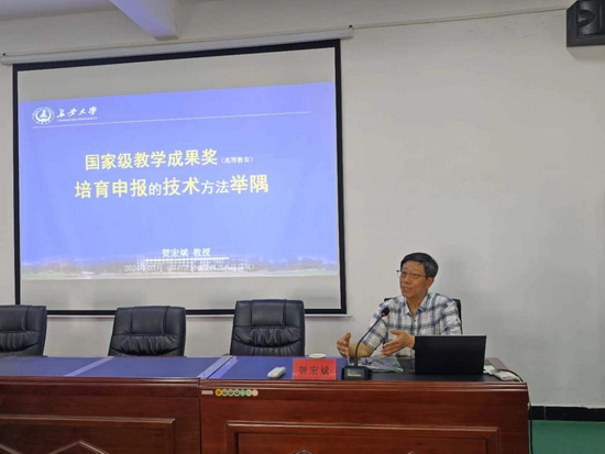 贺宏斌结合典型案例从高等教育教学成果奖申报的背景、制度、导向等方面,围绕教学成果奖项目选题、高水平团队组建、项目成果特色凝练、申报材料撰写等方面作了详尽讲解。他还根据历届国家级教学成果奖获奖项目数据分析和当前高等教育教学改革热点,以及江西省教学成果奖青年培育项目等对我校教学成果奖培育进行了具有针对性和可操作性的指导。