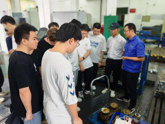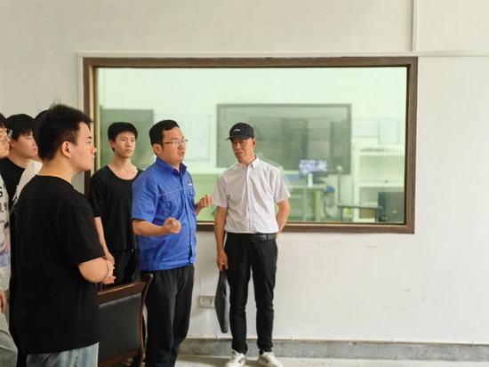在每一个车间,郭迪明副总经理和李兵高级工程师都仔细讲解,并且结合产品对工艺的要求,材料热处理等情况进行说明,郭迪明副总经理还不断地给同学们提问题,比如公差与配合、同轴度、垂直度等是怎样标注的,具体要求如何等。